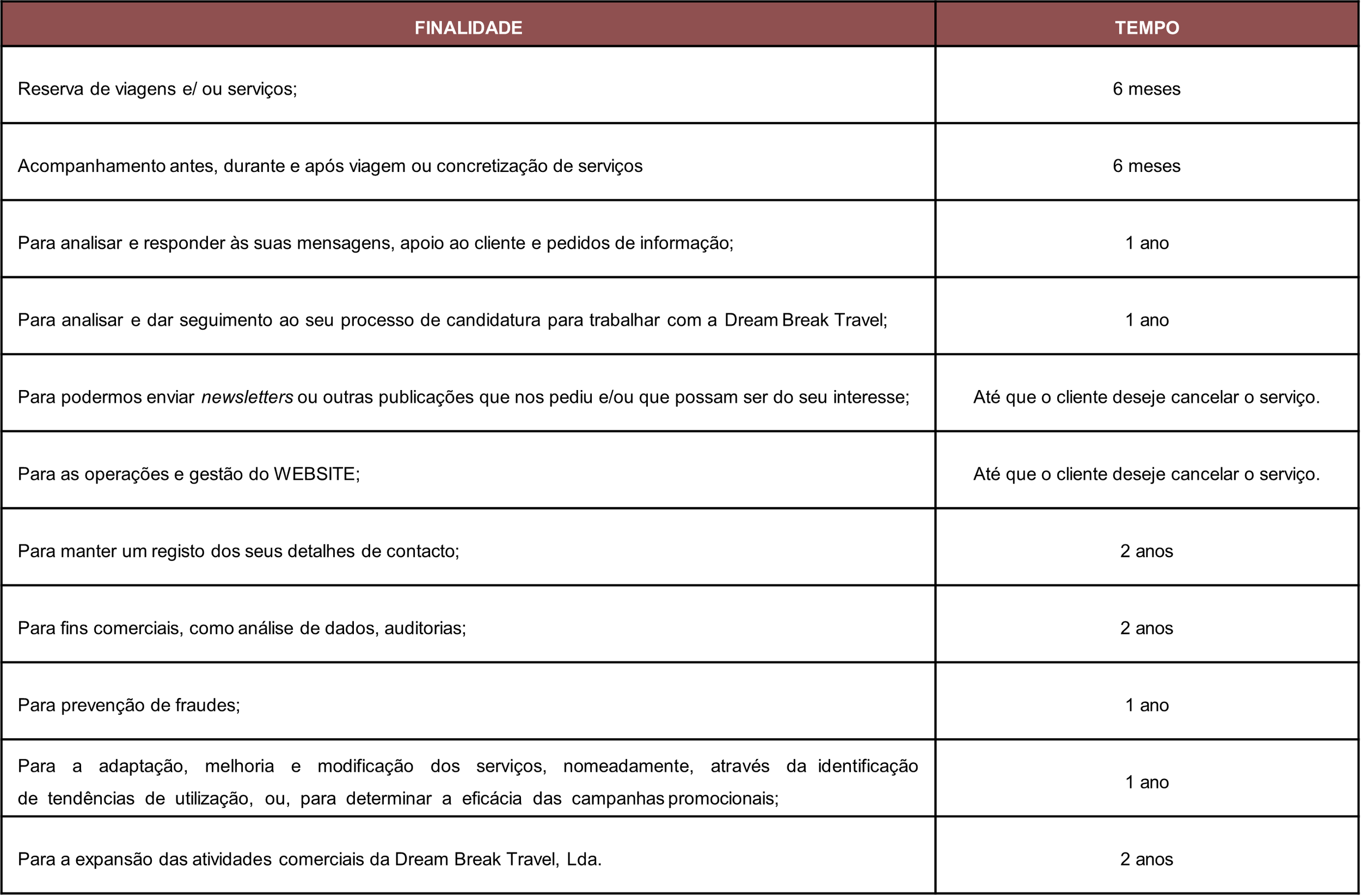 10.2. Caso resulte da lei algum período específico ou obrigatório, o período de conservação dos dados será esse. Em todos os outros casos, os dados pessoais serão conservados no máximo durante os tempos acima indicados, períodos que a Dream Break Travel, Lda entende como suficiente para cumprimento das finalidades.