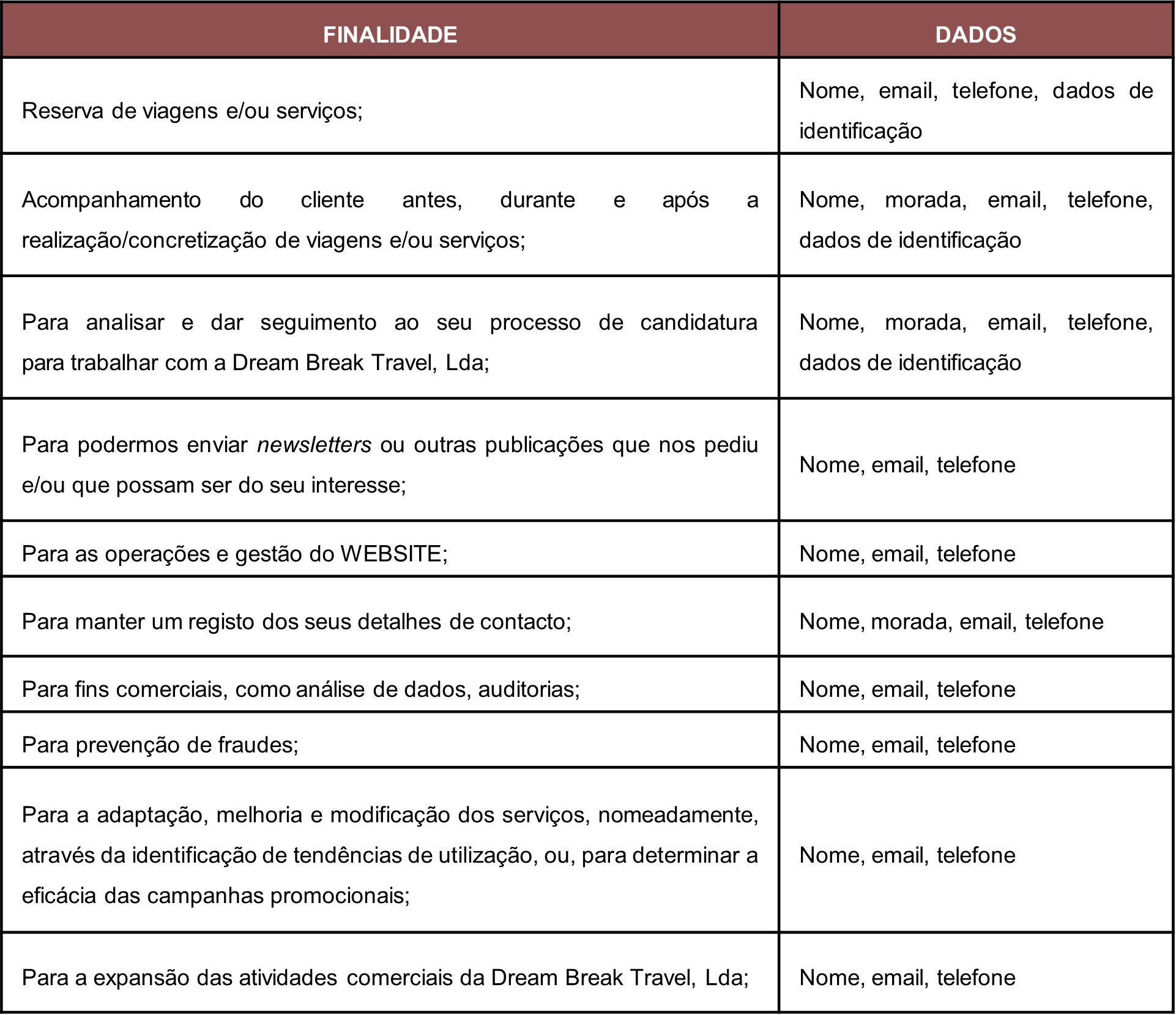 5.2. A Dream Break Travel, Lda irá recolher e tratar os seguintes dados pessoais: